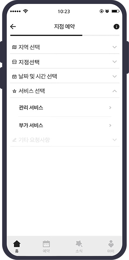 예약메뉴에서 지역, 지점, 날짜/시간, 서비스 종류를 선택하여 예약 가능합니다.